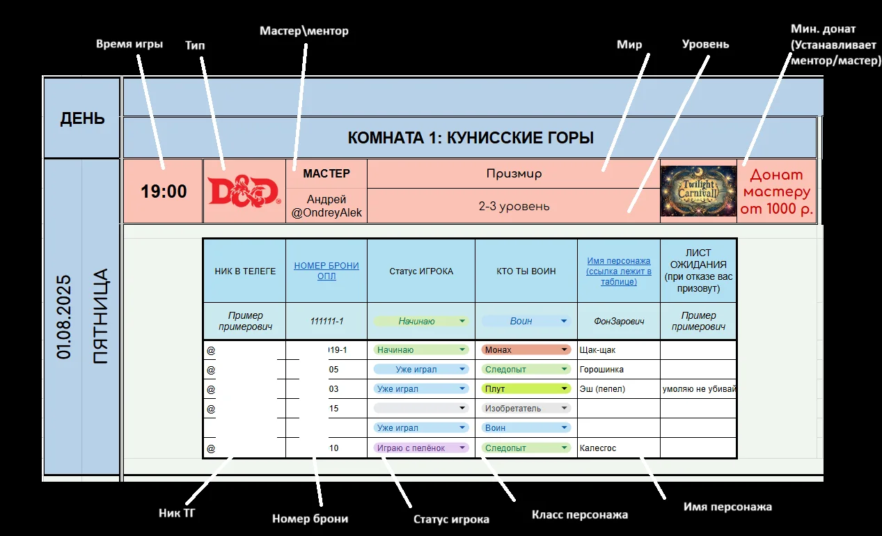 Процесс записи на ДнД обязательно включает в себя заполнение всех полей. Если вы не знаете, как, то нужно написать Мастеру или Ментору, который отмечен в шапке таблицы, - они помогут.
